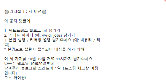 리디챌 1기가 시작된지 일주일이 다 되어가고 있습니다. 리디챌 시작 첫 날(13일) 라이브강의를 했는데요, 절반 넘는 분들이 들어주셔서 정말 감사했어요! 밤 늦은 시간이었는데도 끝까지 들어주셨습니다. 다들 열정이 대단👍🏻